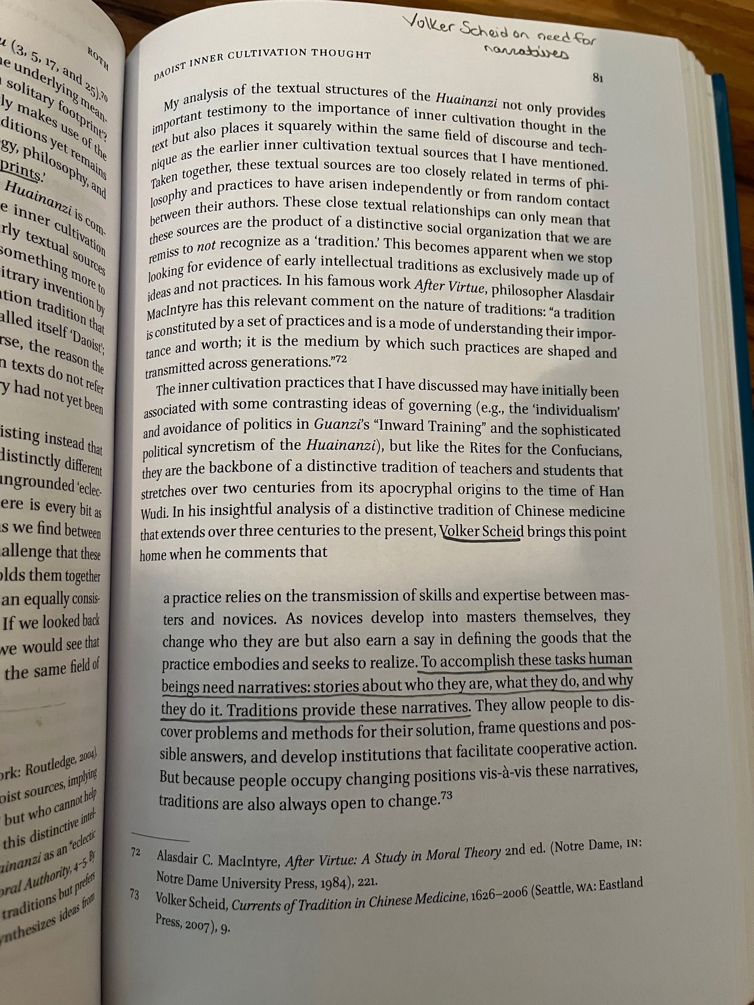 Jianzhi buhuo 見 知 不 惑 “seeing and knowing are never deluded.” A fundamental belief in the Huanglao boshu that differentiates itself from the views of Laozi and Zhuangzi. Another outstanding essay on root-branch structuralism in the Huainanzi by Harold Roth, with finishing thoughts by Volker Sheid on the transmission of tradition. The need for narrative framing and personal navigation in one’s life is something I discuss with my patients often in the clinic, and is a major focus of my upcoming text on the philosophy and modelling of the Lingshu.